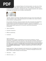 CONVERGENT: questions to which there is one correct answer DIVERGENT: questions inviting learners to express views, opinions or alternatives - the focus here is not on correct/wrong responses YES/NO: questions which can be answered only by a yes or no (e.g. Do you like sports?) OPEN-ENDED: questions which will elicit more language (e.g. What kinds of sports do you like? Why?) Fourthly, I will suggest that there is a group of QUESTIONS TO AVOID. These are questions which teachers are advised not to use for the following reasons: They express irony / sarcasm (e.g. Are you awake X?) They are not likely to elicit a true or helpful response (e.g. Do you understand?) They may embarrass the learners (e.g. Why have your parents divorced?) Finally, I will focus on the use of certain types of questions for the purpose of grammar awareness, reading skills development and class management. The paper focuses on genuine questions, that is question forms which require an answer, but also gives examples of questions which perform other functions.