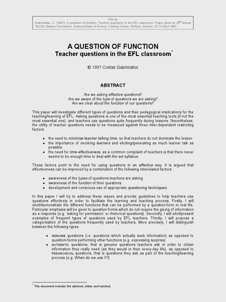 Cite as: Gabrielatos, C. (1997). A question of function: Teacher questions in the EFL classroom.