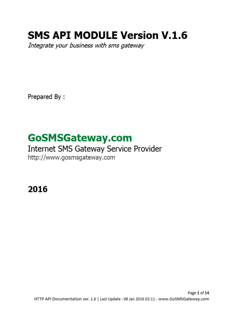 HTTP API Documentation ver. 1.6 | Last Update : 08 Jan 2016 02:11 - www.GoSMSGateway.com