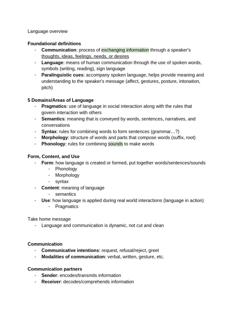 - Pragmatics (use), semantics (content), syntax, morphology, phonology (form)