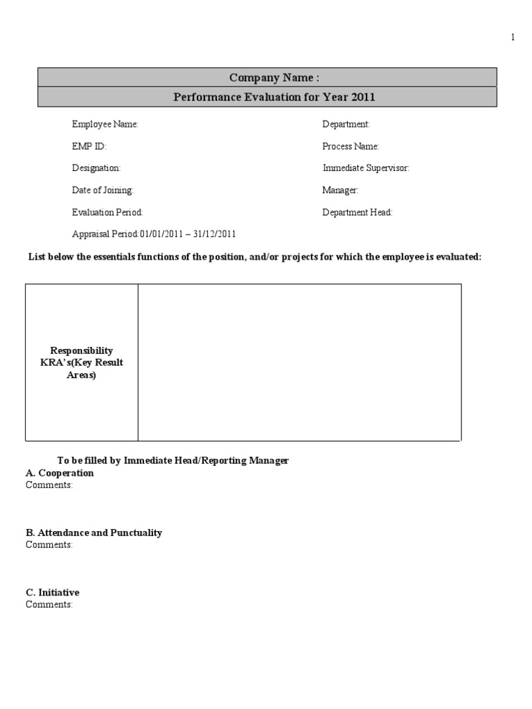 Employee Name: EMP ID: Designation: Date of Joining: Evaluation Period: Appraisal Period:01/01/2011 31/12/2011 Department: Process Name: Immediate Supervisor: Manager: Department Head:
