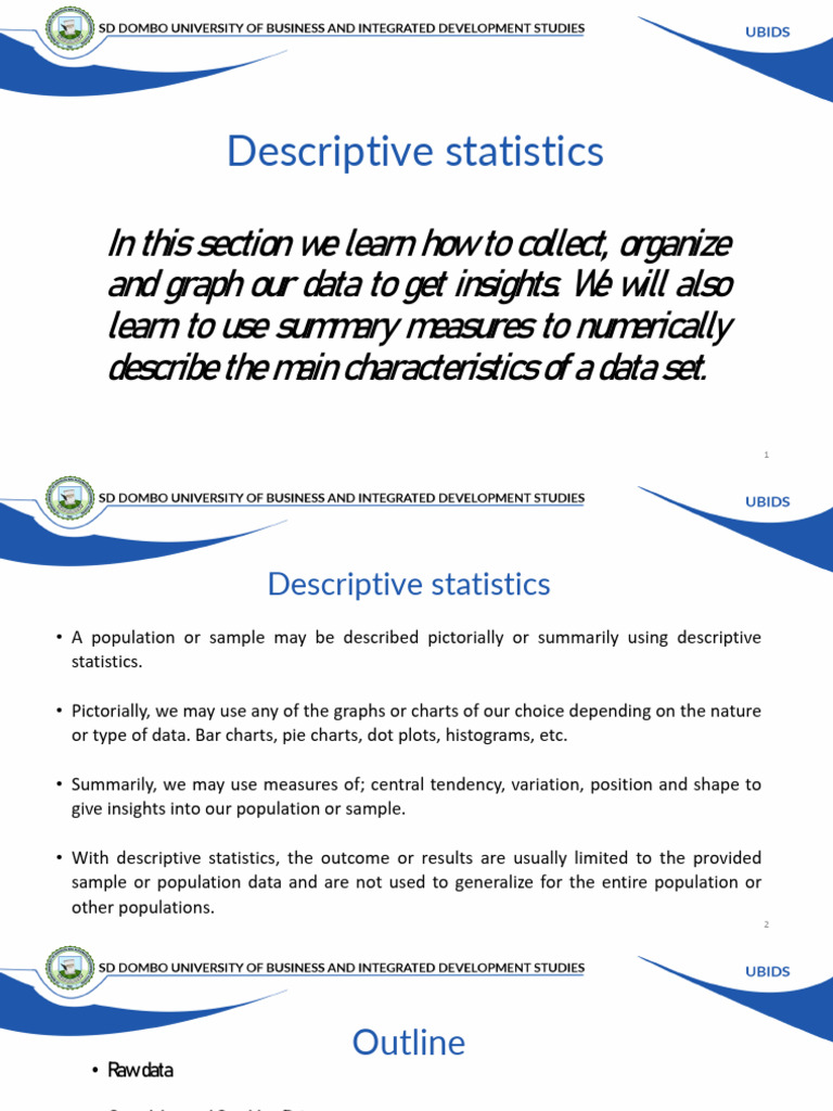 • Summarily, we may use measures of; central tendency, variation, position and shape to