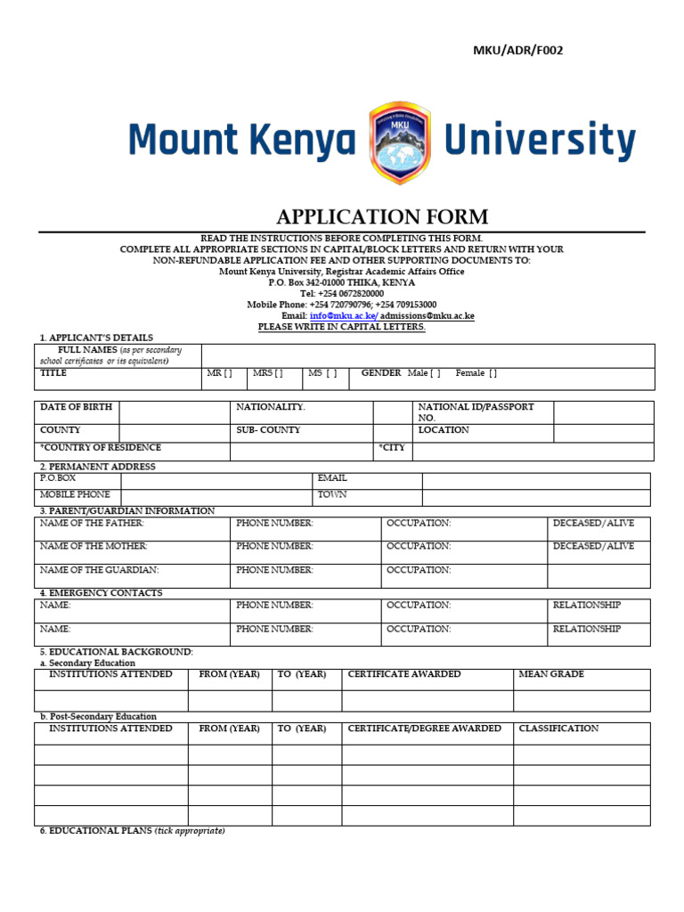 More information may be obtained from the Office of Registrar, Academic Affairs Mount Kenya University