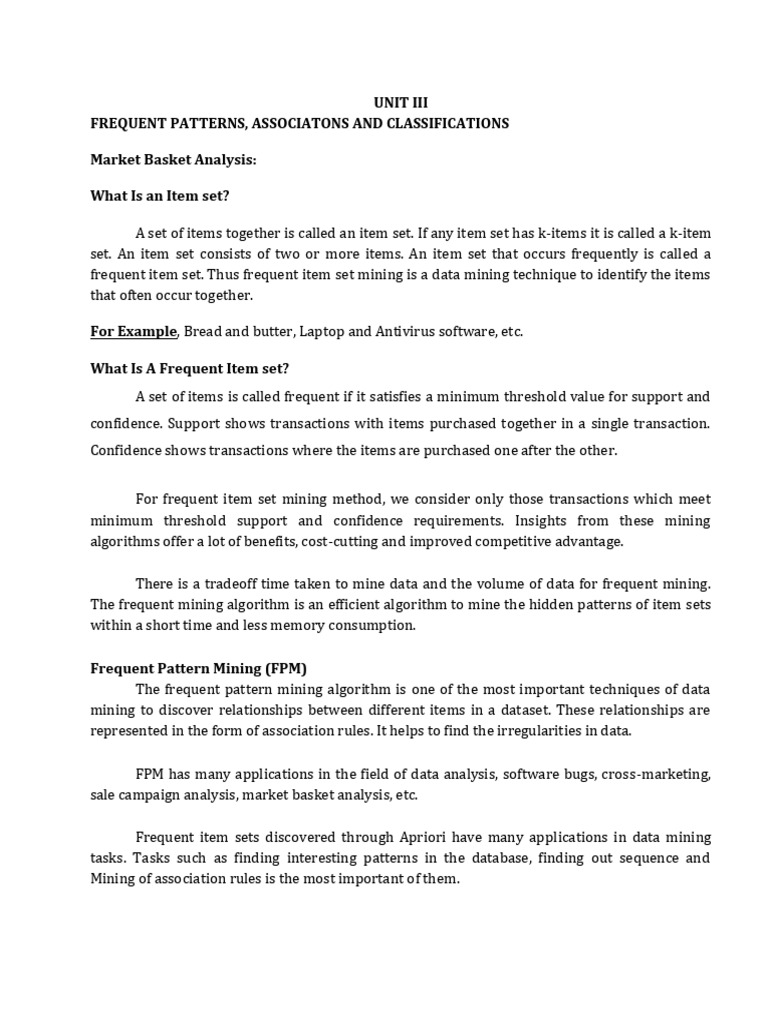 FREQUENT PATTERNS, ASSOCIATONS AND CLASSIFICATIONS