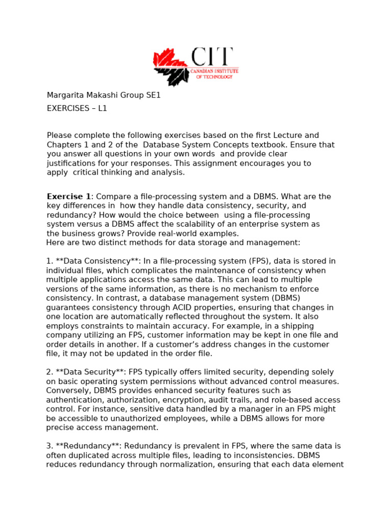 Exercise 1: Compare a file-processing system and a DBMS. What are the