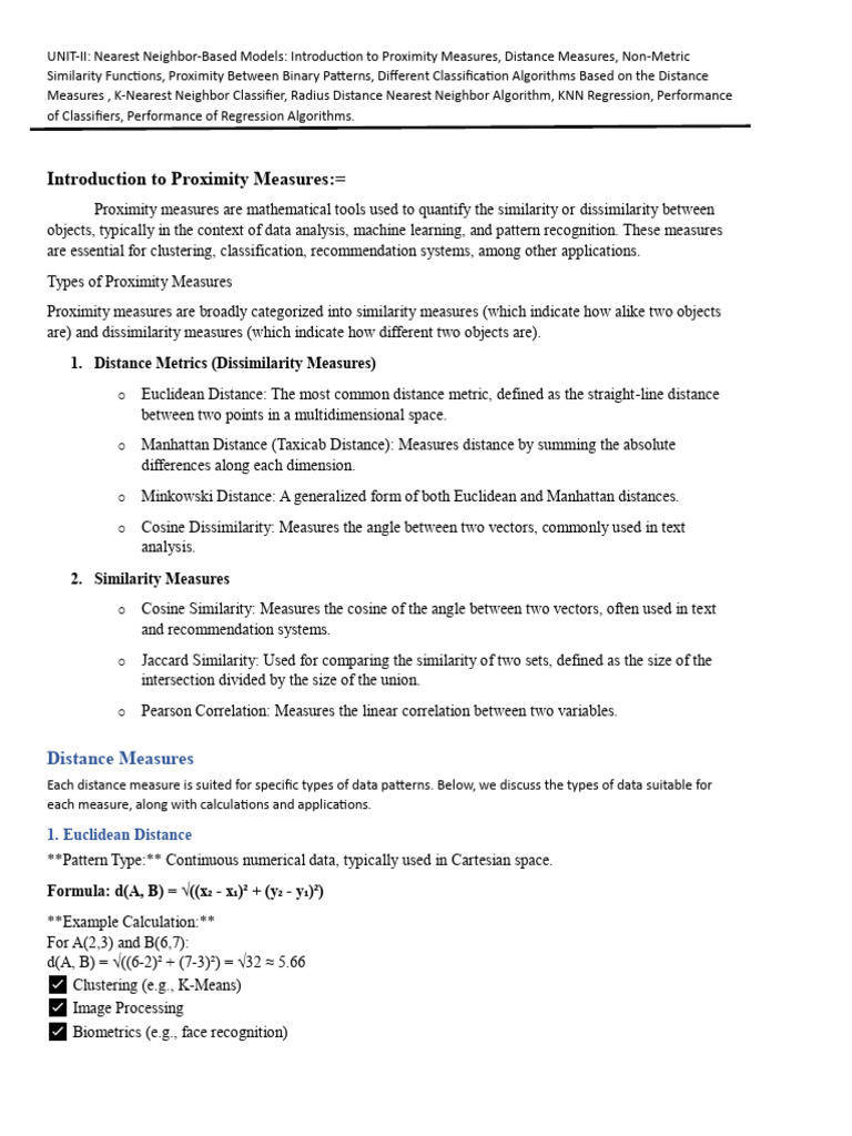 UNIT-II: Nearest Neighbor-Based Models: Introduction to Proximity Measures, Distance Measures, Non-Metric