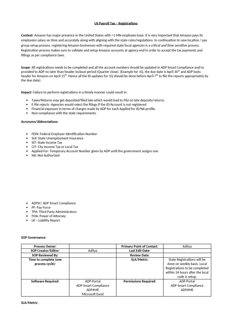 Scope: All registrations needs to be completed and all the account numbers should be updated in ADP Smart Compliance and/or