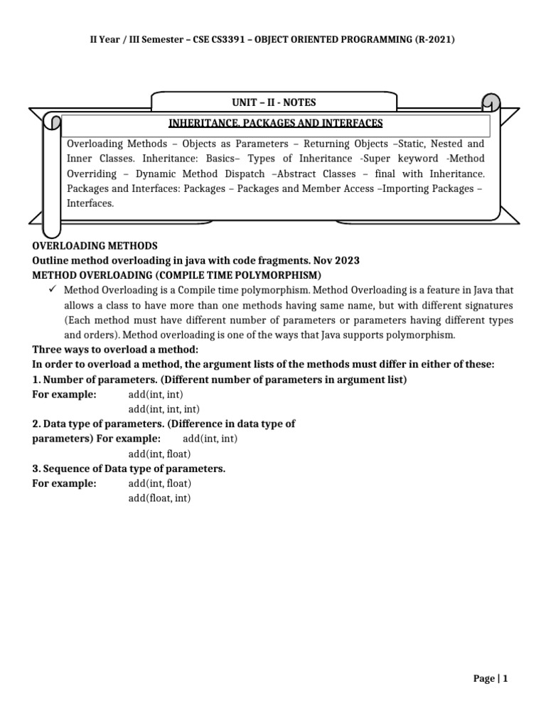 II Year / III Semester – CSE CS3391 – OBJECT ORIENTED PROGRAMMING (R-2021)