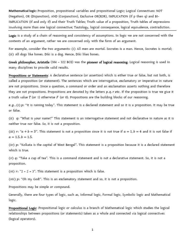 Propositions or Statements: A declarative sentence (or assertion) which is either true or false, but not both, is