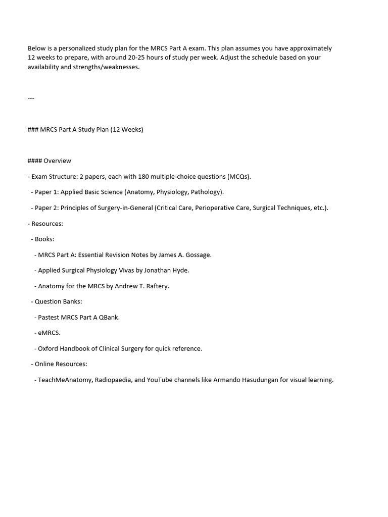 Below is a personalized study plan for the MRCS Part A exam.
