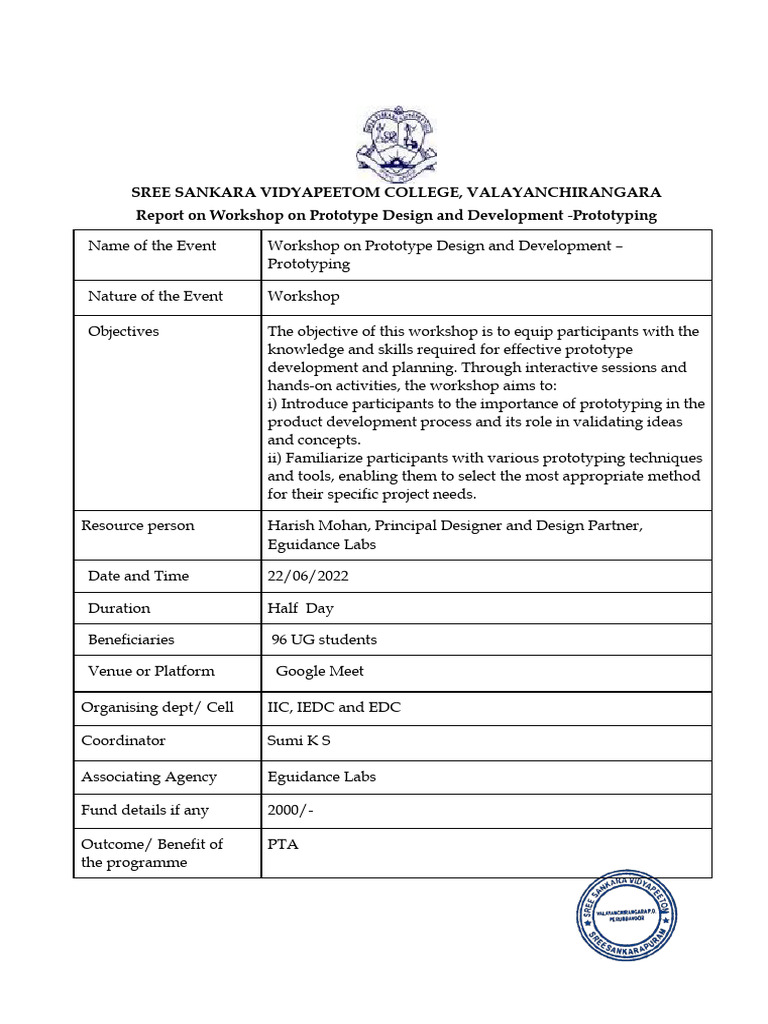 Sree Sankara Vidyapeetom College arranged a workshop on prototype process and planning