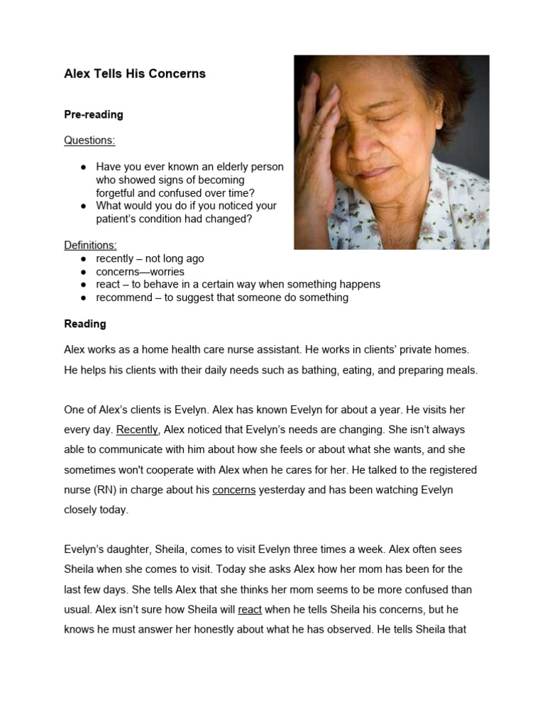 One of Alex’s clients is Evelyn. Alex has known Evelyn for about a year. He visits her