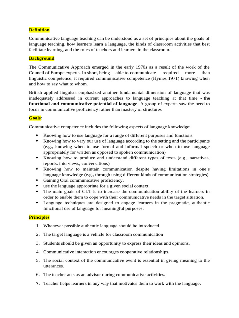 Communicative language teaching can be understood as a set of principles about the goals of