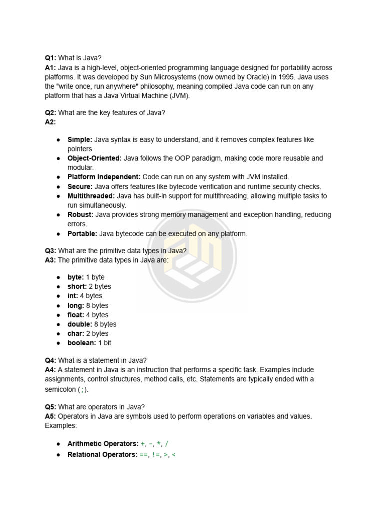 A1: Java is a high-level, object-oriented programming language designed for portability across
