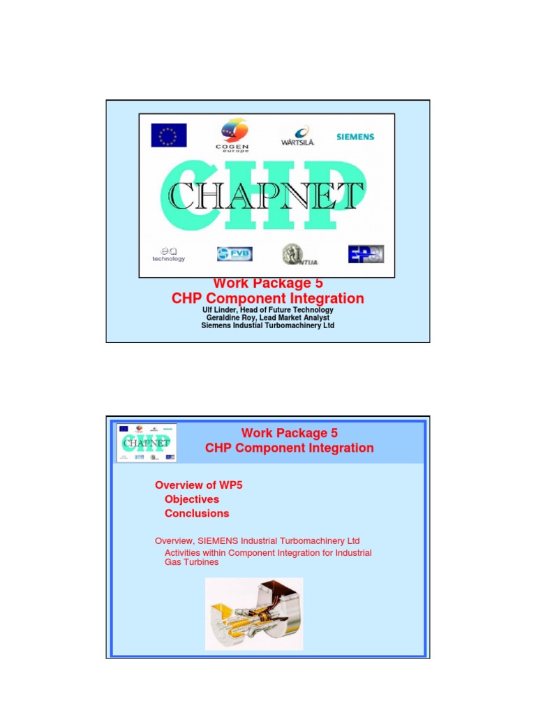 Gasification of Biomass and Power Generation, TPS Gasification and Gas Engine, Wartsila Gas turbines Technology Development trends, DDIT The Evaporative Gas Turbine demonstration Project, Lund University Connecting to the grid, Powerformer Technology, ABB Research and Development at Mlardalens University Absorption chillers in Cooling and Tri-generation applications, WEIR Entropie Gas Turbines and Chillers Integration, DDIT Fogging and High Fogging : ALSTOMs Experience and Customer Benefits, ALSTOM Power SOFC - Future CHP, Siemens Gas engines Maintenance philosophies, Wrtsil CHP Systems Integration, Tecnicas Reunidas Biofuel based CHP production in Sweden and CHP R&D at CEDER (Soria/Spain), CIEMAT
