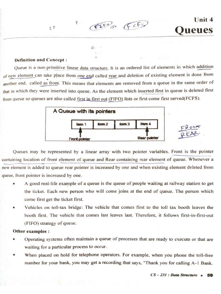 from queue so queues are also called first in first out (FIFO) lists or first come first served(FCFS).
