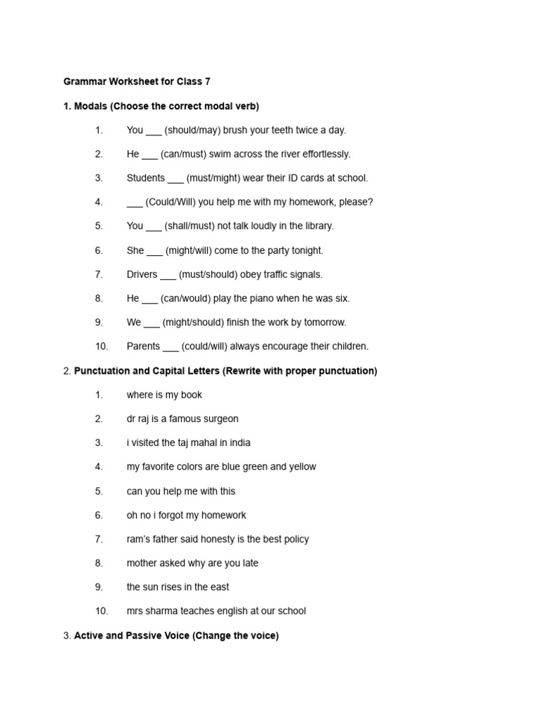 Grammar Worksheet for Class 7