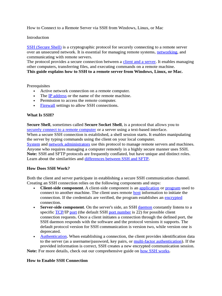 This guide explains how to SSH to a remote server from Windows, Linux, or Mac.
