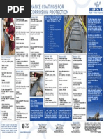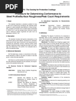 A2.2 TWO POINT CALIBRATION ADJUSTMENT: This example uses two shim values, one above and one below the expected lm thickness to be measured. It should be noted that not all lm thickness gages can be adjusted in this manner. Assuming that the coating thickness to be measured is 100 m (4.0 mil), then shims of 250 m (10.0 mil) and 50 m (2.0 mil) are appropriate for setting the upper and lower values on the scale of the gage. As protective coatings are normally applied to blast cleaned metal surfaces, a statistical approach is required to obtain a typical value for the adjustment. Ten readings on a shim are sufcient to establish a reliable average value for that shim on the roughened surface. Following the manufacturers instructions, the gage is adjusted so that the actual shim thickness is then used to set the gage. This procedure should be repeated for both the upper and lower shim values. The average of 10 readings on an intermediate shim, approximately 100 m (4.0 mil) thick in the case described above, will conrm that the gage has been adjusted correctly. It is acceptable for the average reading to be within 4% of the shim thickness. This method ensures that the gage reads the thickness of the coating over the peaks of the prole. A2.3 SMOOTH SURFACE CALIBRATION ADJUSTMENT: If access to the bare blast cleaned substrate is not available because the coating already covers it, a smooth surface can be used to adjust the gage. Adjust the gage on a smooth surface according to the manufacturers instructions. Readings taken on the blast-cleaned substrate will be higher than the true value by an amount dependant on the surface prole and the gage probe design. For most applications a correction value of 25 m (1.0 mil) is generally applicable. Note that this value is not related to the actual surface prole measurement. This correction value must be subtracted from each gage reading to correct for the effect of the prole. The resulting corrected reading represents the thickness of the coating over the peaks. For ne proles the correction value may be as low as 10 m (0.4 mil) but for coarse proles it could be as high as 40 m (1.6 mil). Table A2 gives approximate correction values to be used when a blast cleaned surface is not available to adjust the gage. The use of coated standards to adjust gages means that a correction value must be applied to readings as the coated standards make use of smooth substrate surfaces.
