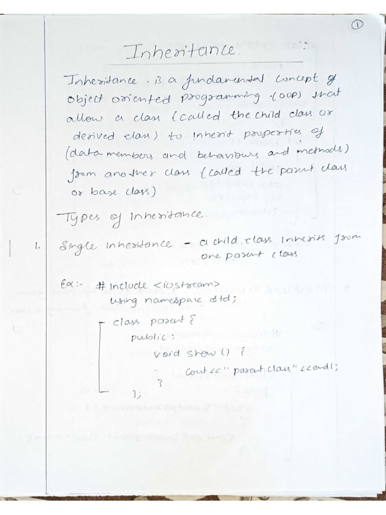 The document discusses the concept of inheritance in programming, specifically focusing on single inheritance where a child class inherits from one parent class. It includes examples and references to object-oriented programming principles. The text appears to be fragmented and contains numerous typographical errors, making it difficult to extract coherent information.