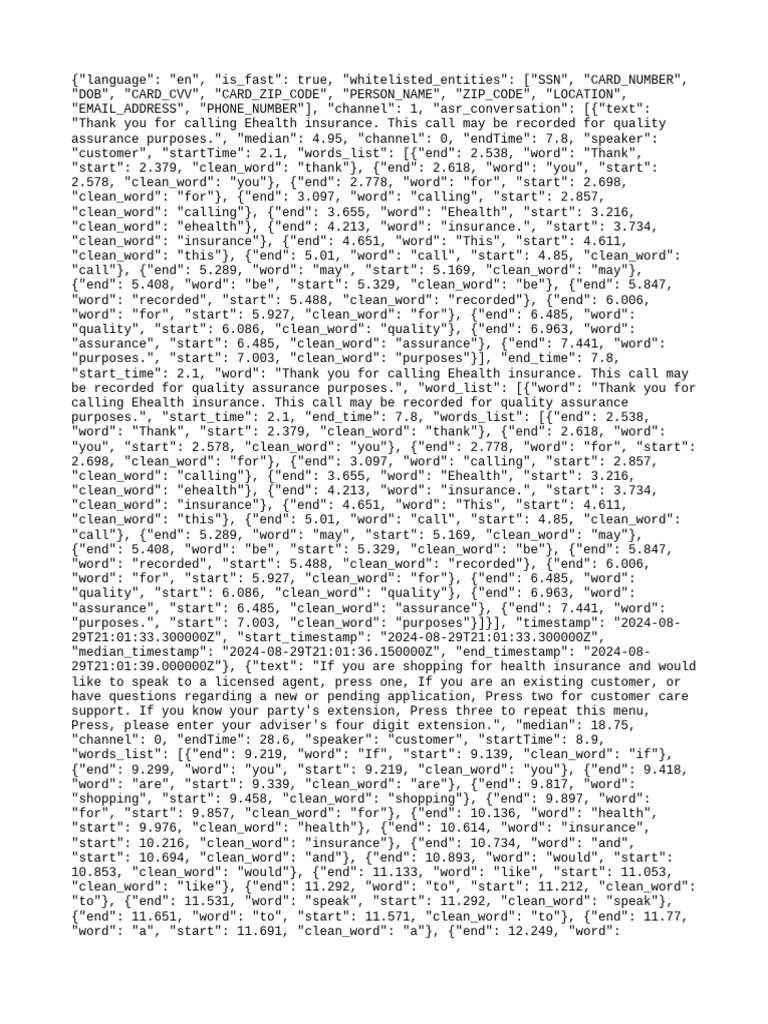 The document contains a transcript of a call to Ehealth insurance, detailing options for customers. It provides instructions for speaking with a licensed agent, customer care support, or entering an advisor's extension. The call is recorded for quality assurance purposes.