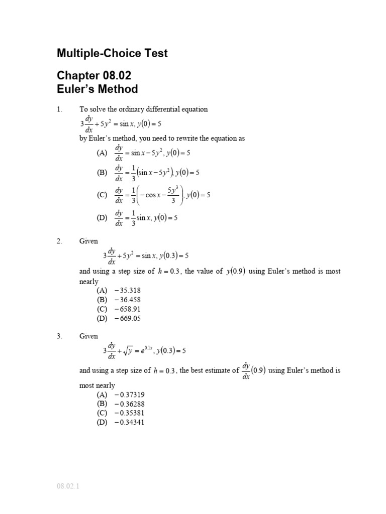 and using a step size of h = 0.3 , the best estimate of (0.9) using Euler’s method is
