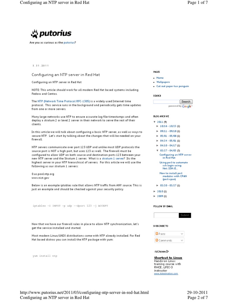 Configuring an NTP server in Red Hat NOTE: This article should work for all modern Red Hat based systems including Fedora and Centos. The NTP (Network Time Protocol RFC-1305) is a widely used Internet time protocol. This service runs in the background and periodically gets time updates from one or more servers. Many large networks use NTP to ensure accurate log file timestamps and often deploy a stratum 2 or level 2 server in their network to serve the rest of their clients. In this article we will talk about configuring a basic NTP server, as well as ways to secure NTP. Let's start by talking about the changes that will be needed on your firewall. NTP servers communicate over port 123 UDP and unlike most UDP protocols the source port is NOT a high port, but uses 123 as well. The firewall must be configured to allow UDP on both source and destination ports 123 between your new NTP server and the Stratum 1 server. What is a stratum 1 server? Its the highest server in your NTP hierarchical of servers. For this article we will use the following as our stratum 1 servers: 0.us.pool.ntp.org wwv.nist.gov Below is an example iptables rule that allows NTP traffic from ANY source. This is just an example and should be checked against your security policy.