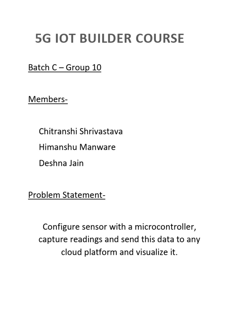 The document outlines the 5G IoT Builder Course for Batch C, Group 10, consisting of members Chitranshi Shrivastava, Himanshu Manware, and Deshna Jain. The problem statement focuses on configuring a sensor with a microcontroller to capture readings, transmit the data to a cloud platform, and visualize the information. This project emphasizes practical applications of IoT technology in a 5G context.