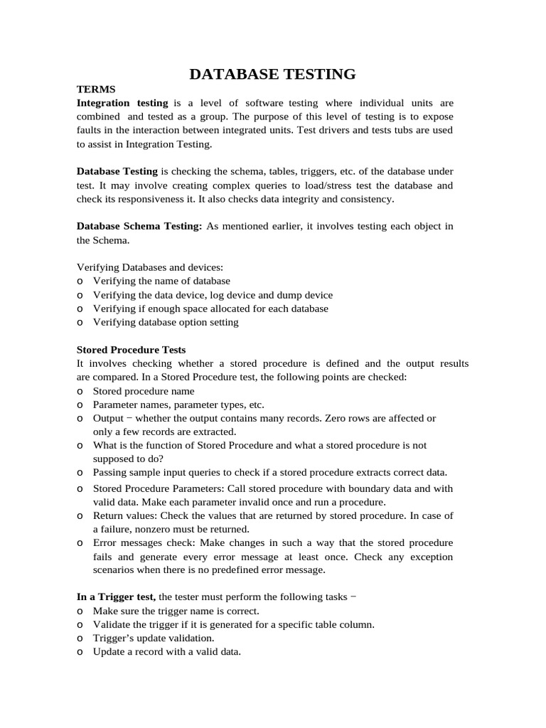 Database Testing is checking the schema, tables, triggers, etc. of the database under