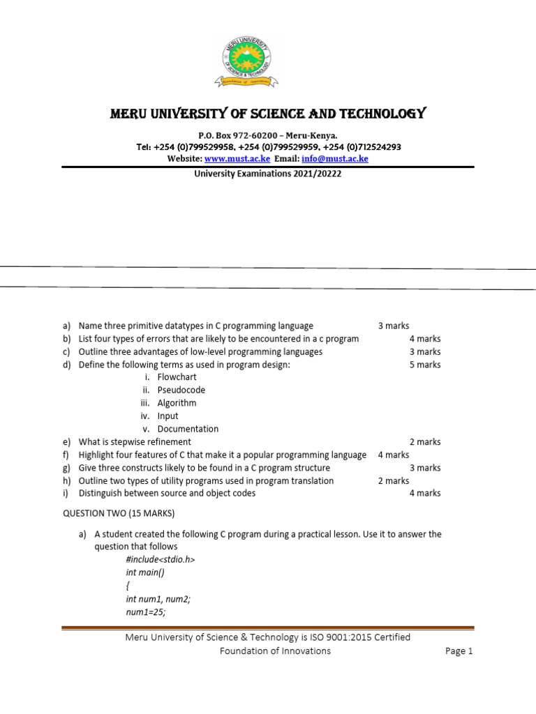 f) Highlight four features of C that make it a popular programming language 4 marks