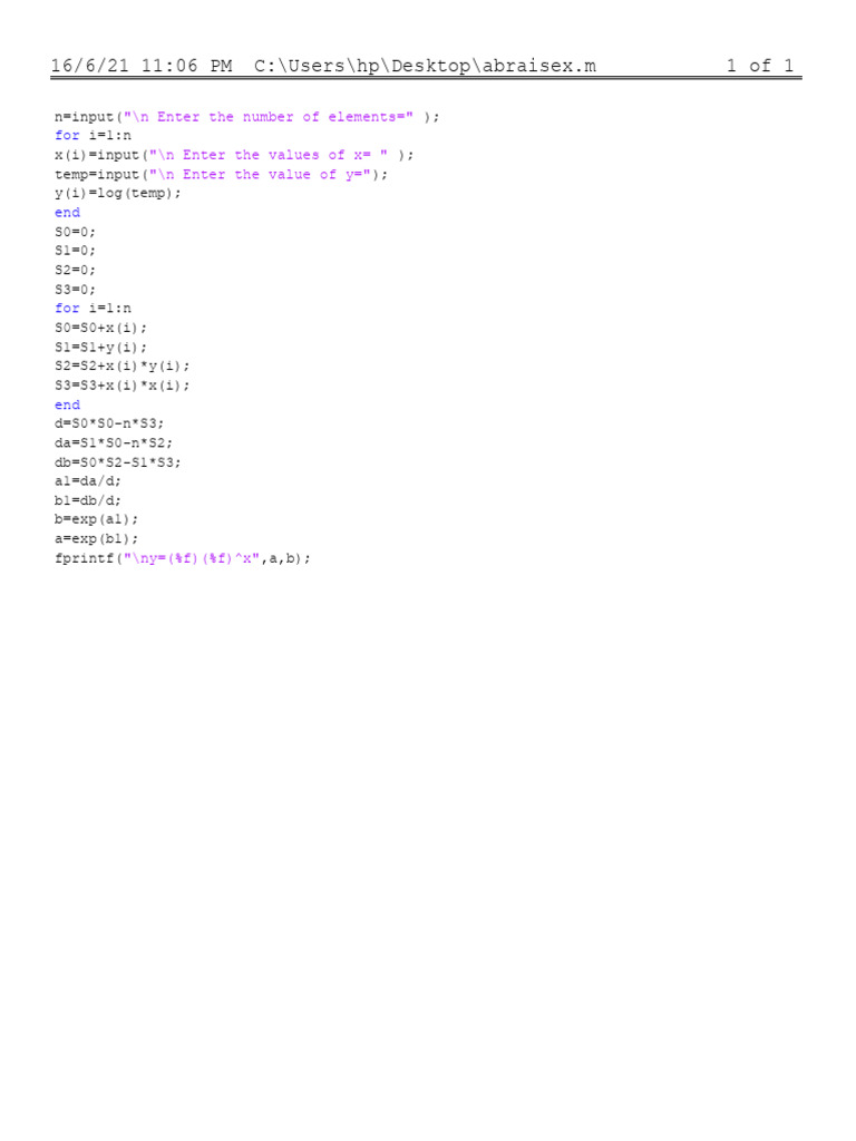 fprintf("\ny=(%f)x^(%f)",a,b);