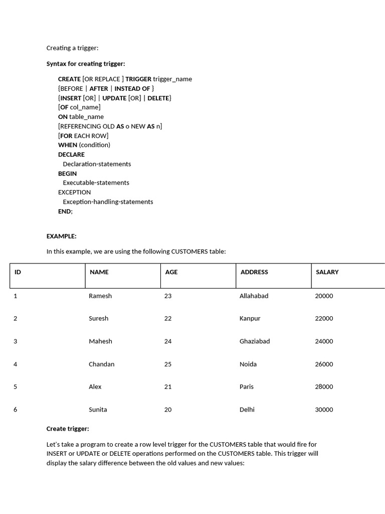 Let's take a program to create a row level trigger for the CUSTOMERS table that would fire for
