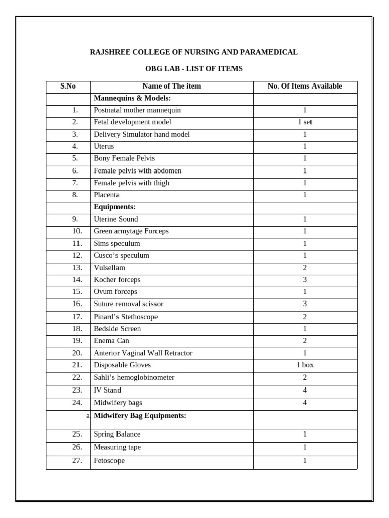 OBG LAB - LIST OF ITEMS