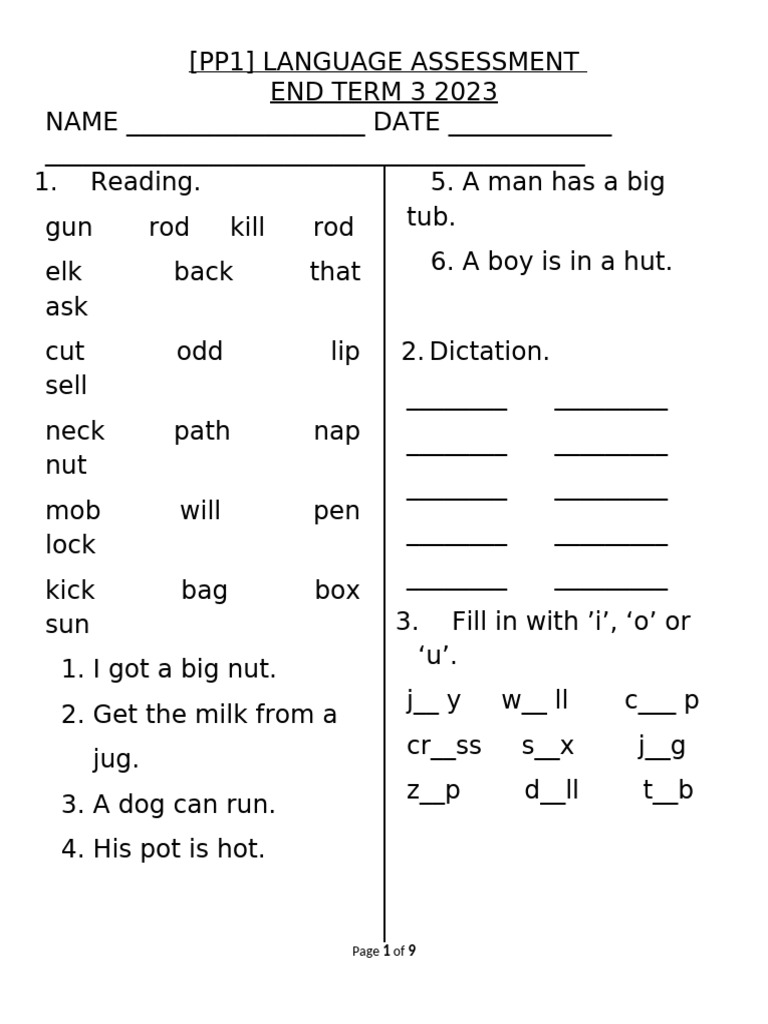 ELEPHANT CLASS [PP1] MATHEMATICS ASSESSMENT,