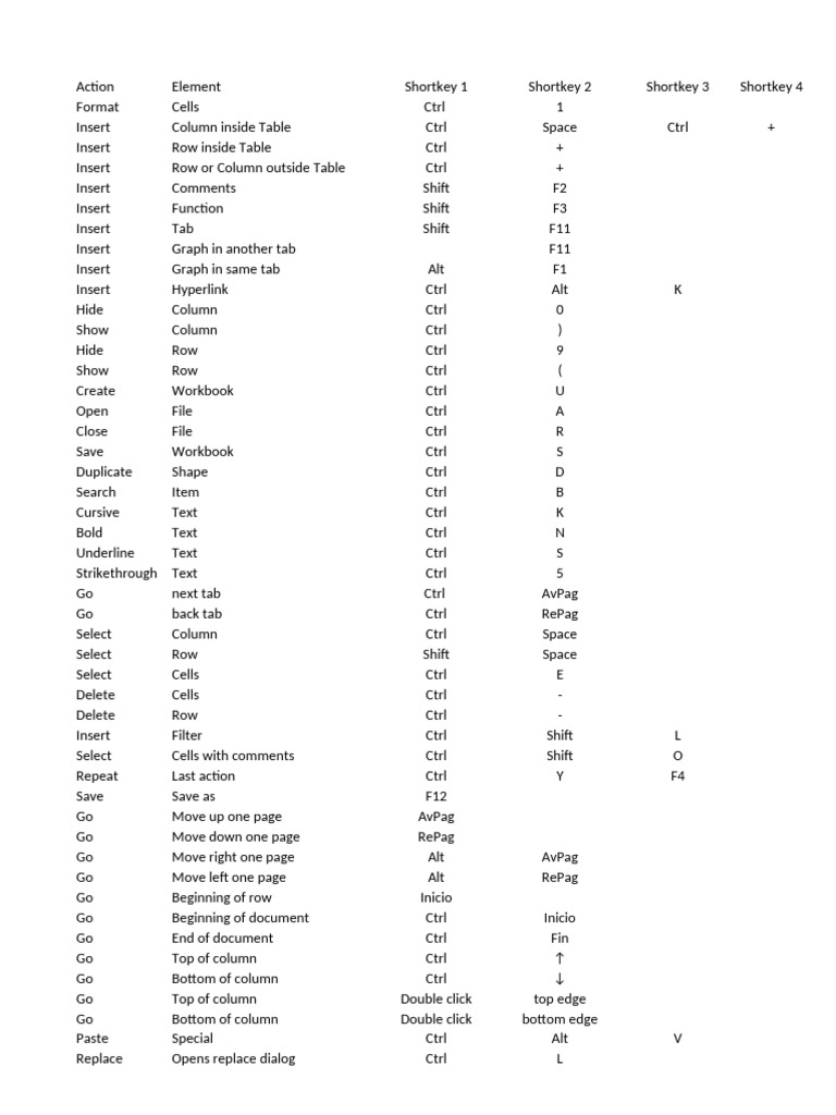 Action Element Shortkey 1 Shortkey 2 Shortkey 3 Shortkey 4