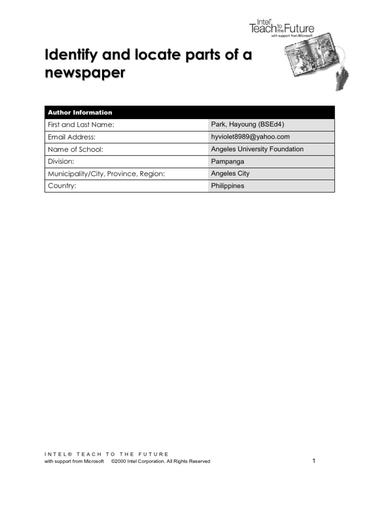 Many people use the newspaper as a daily source of information and current events. A newspaper has the task of informing and entertaining, often simultaneously. A basic article contains standard components that make up the entire article. Students learning about newspapers, or learning how to write a newspaper article, must learn to identify parts of a newspaper. Students will be able to locate articles of interest and readability. With these separate parts, an article will catch the reader's attention and provide the important details, presenting a well-rounded and complete piece of information. Students become familiar with the identify and located parts of a newspaper. Students recognize the parts of a newspaper and articles in the newspaper.