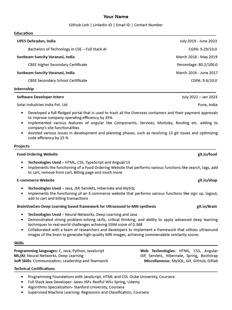 Programming languages: C, Java, Python, JavaScript Web Technologies: HTML, CSS, Angular