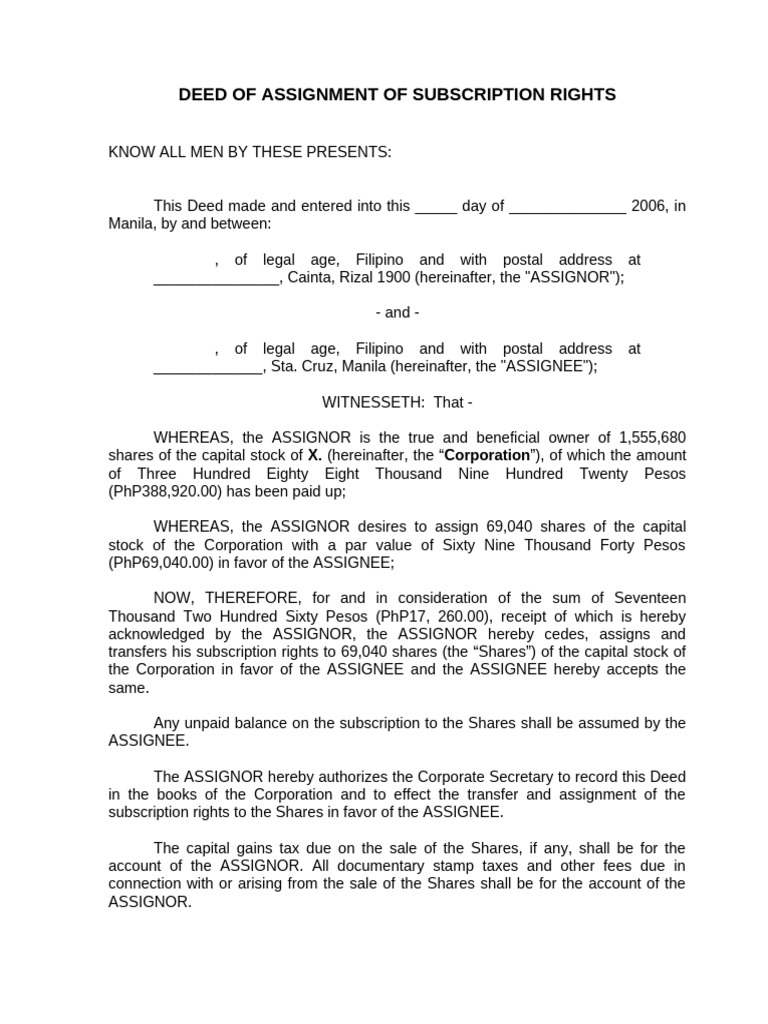 DEED OF ASSIGNMENT OF SUBSCRIPTION RIGHTS