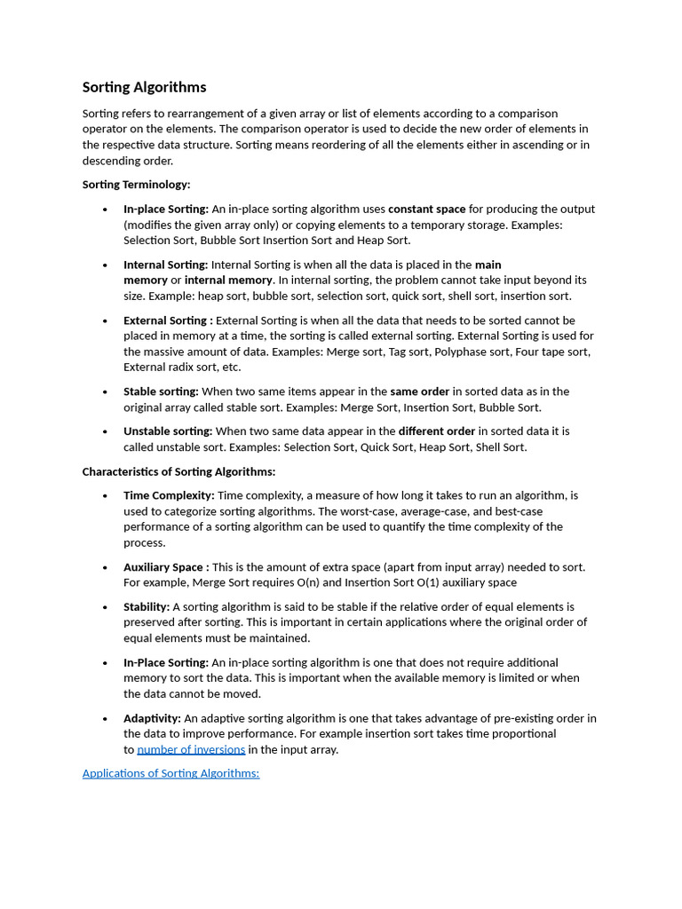 Stability: A sorting algorithm is said to be stable if the relative order of equal elements is