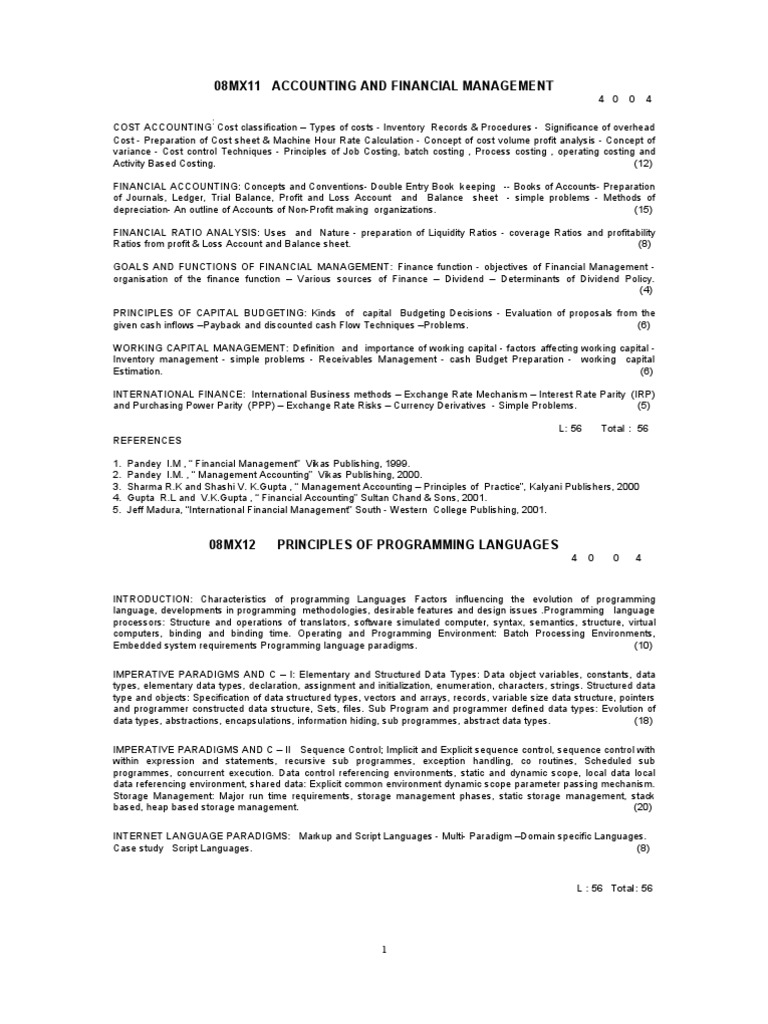 COST ACCOUNTING Cost classification Types of costs - Inventory Records & Procedures - Significance of overhead Cost - Preparation of Cost sheet & Machine Hour Rate Calculation - Concept of cost volume profit analysis - Concept of variance - Cost control Techniques - Principles of Job Costing, batch costing , Process costing , operating costing and Activity Based Costing. (12) FINANCIAL ACCOUNTING: Concepts and Conventions- Double Entry Book keeping -- Books of Accounts- Preparation of Journals, Ledger, Trial Balance, Profit and Loss Account and Balance sheet - simple problems - Methods of depreciation- An outline of Accounts of Non-Profit making organizations. (15) FINANCIAL RATIO ANALYSIS: Uses and Nature - preparation of Liquidity Ratios - coverage Ratios and profitability Ratios from profit & Loss Account and Balance sheet. (8) GOALS AND FUNCTIONS OF FINANCIAL MANAGEMENT: Finance function - objectives of Financial Management organisation of the finance function Various sources of Finance Dividend Determinants of Dividend Policy. (4) PRINCIPLES OF CAPITAL BUDGETING: Kinds of capital Budgeting Decisions - Evaluation of proposals from the given cash inflows Payback and discounted cash Flow Techniques Problems. (6) WORKING CAPITAL MANAGEMENT: Definition and importance of working capital - factors affecting working capital Inventory management - simple problems - Receivables Management - cash Budget Preparation - working capital Estimation. (6) INTERNATIONAL FINANCE: International Business methods Exchange Rate Mechanism Interest Rate Parity (IRP) and Purchasing Power Parity (PPP) Exchange Rate Risks Currency Derivatives - Simple Problems. (5) L: 56 REFERENCES 1. 2. 3. 4. 5. Pandey I.M , Financial Management Vikas Publishing, 1999. Pandey I.M. , Management Accounting Vikas Publishing, 2000. Sharma R.K and Shashi V. K.Gupta , Management Accounting Principles of Practice, Kalyani Publishers, 2000 Gupta R.L and V.K.Gupta , Financial Accounting Sultan Chand & Sons, 2001. Jeff Madura, International Financial Management South - Western College Publishing, 2001. Total : 56