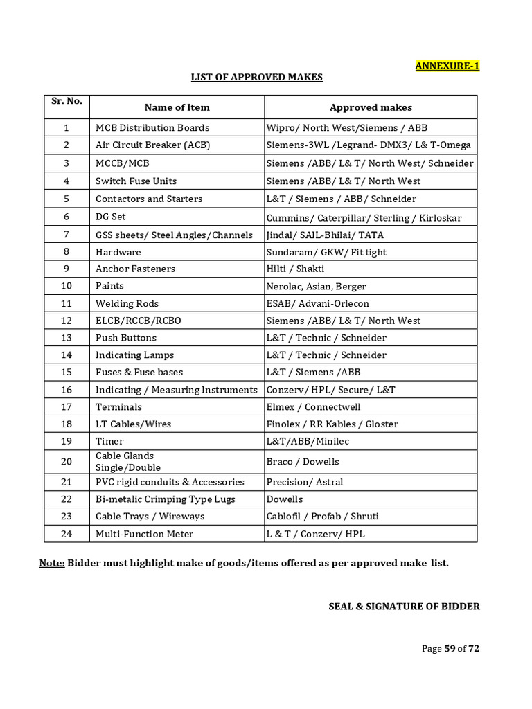 Note: Bidder must highlight make of goods/items offered as per approved make list.