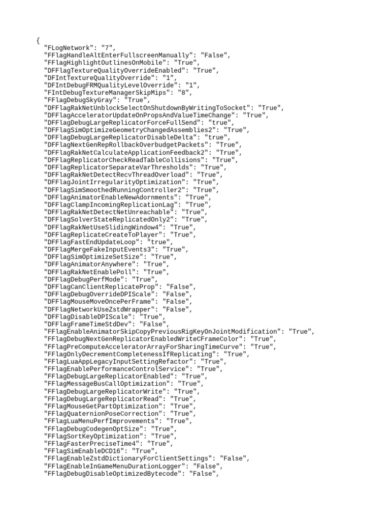 The document contains a list of configuration flags and integer parameters related to network performance, graphics optimization, and debugging features. Various flags are set to enable or disable specific functionalities, such as texture quality overrides, replication settings, and telemetry controls. Additionally, the document includes performance control settings and limits for packet processing and network quality management.