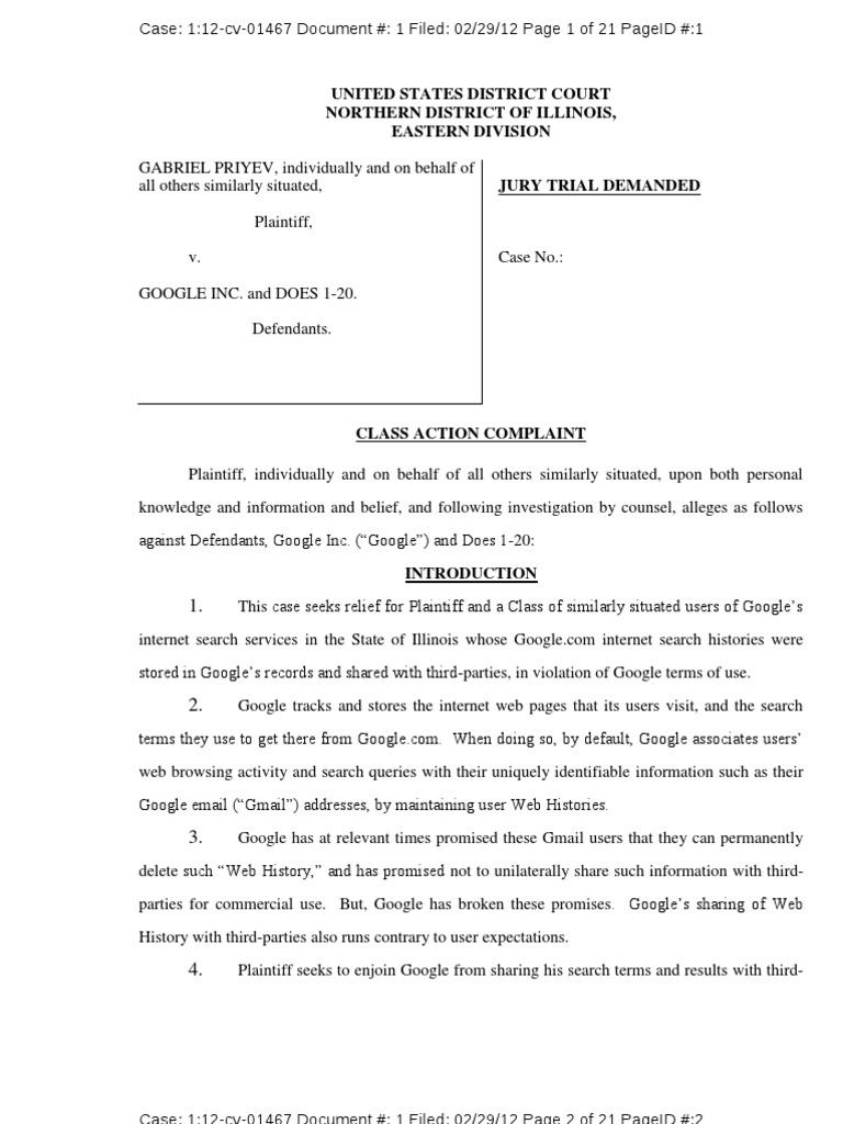 UNITED STATES DISTRICT COURT NORTHERN DISTRICT OF ILLINOIS, EASTERN DIVISION GABRIEL PRIYEV, individually and on behalf of all others similarly situated, Plaintiff, v. GOOGLE INC. and DOES 1-20. Defendants. Case No.: JURY TRIAL DEMANDED