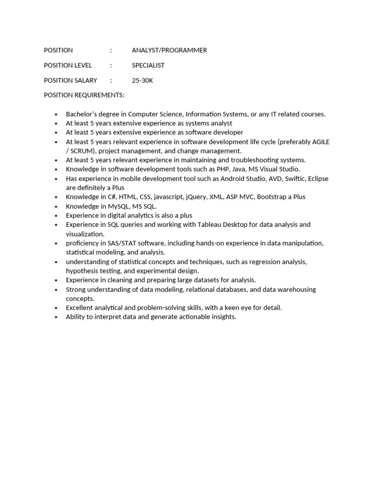 Bachelor’s degree in Computer Science, Information Systems, or any IT related courses.