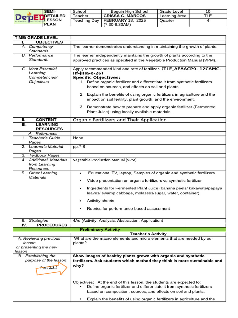 DETAILED Teacher CRISSA G. MARCOS Learning Area TLE