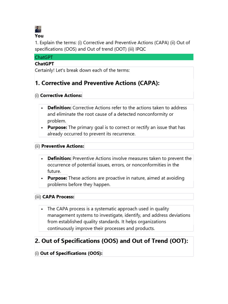 1. Explain the terms: (i) Corrective and Preventive Actions (CAPA) (ii) Out of