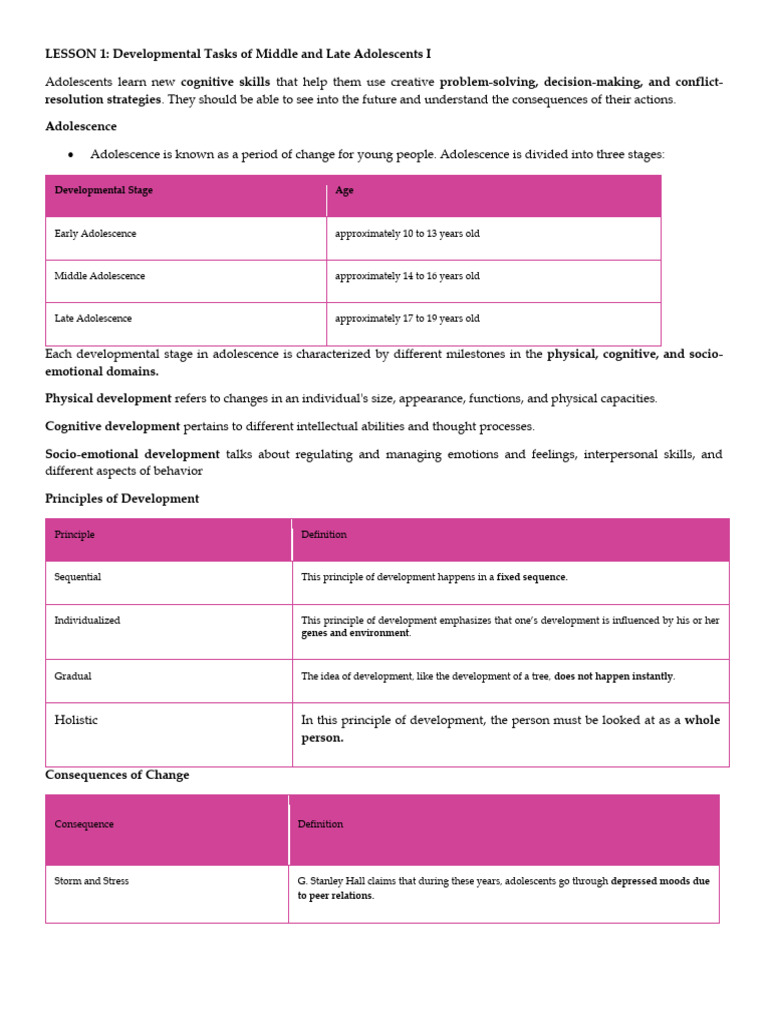 LESSON 1: Developmental Tasks of Middle and Late Adolescents I