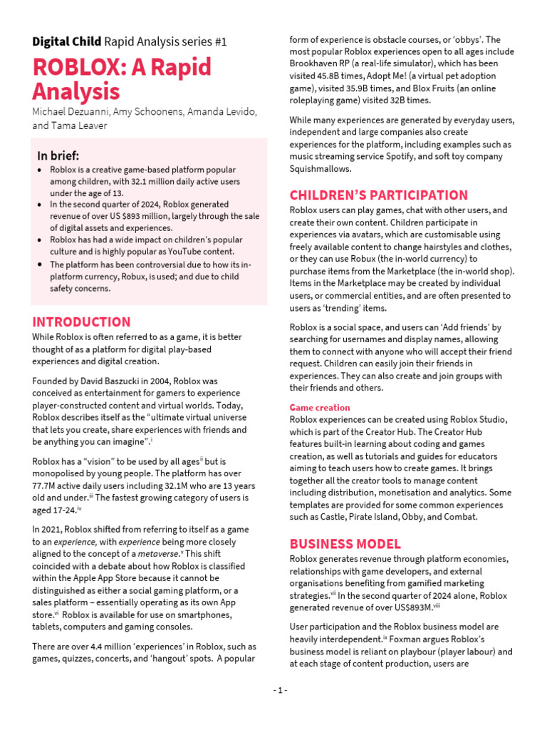 In 2023, 5M developers and creators earned Robux on the platform, and Manifesto for a Better Children’s Internet. Australian Research Council