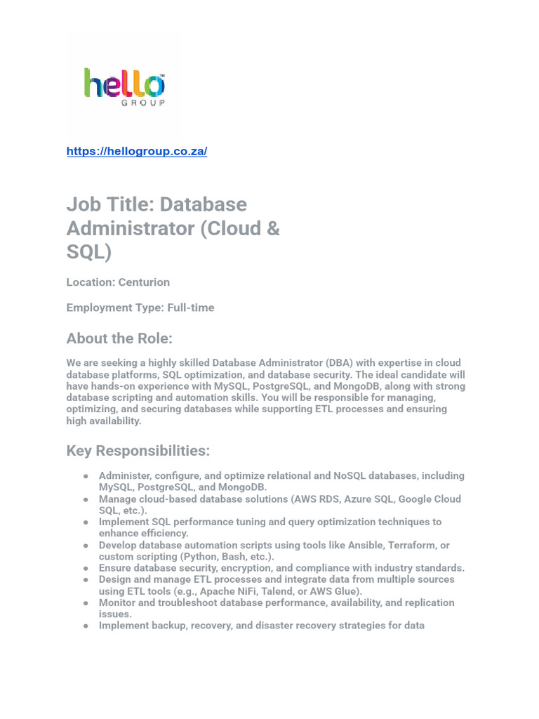 We are seeking a highly skilled Database Administrator (DBA) with expertise in cloud