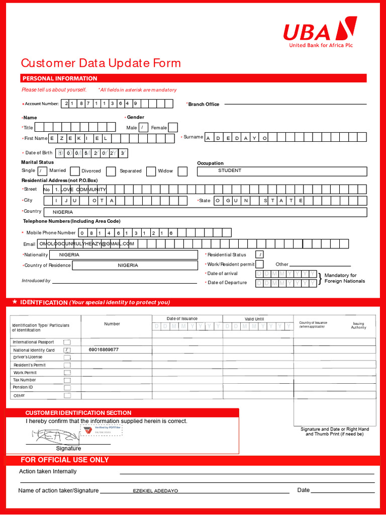 Name of action taker/Signature EZEKIEL ADEDAYO Date